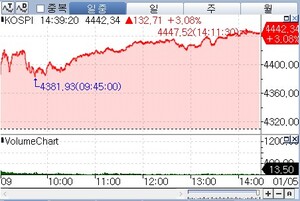 코스피 지수는 4,442.34포인트로 전 거래일보다 132.71포인트(3.08%) 상승하며 4400선을 넘어섰습니다. 이날 오후에도 상승세를 이어가고 있으며, 시가총액 1위인 삼성전자는 이날도 7.24% 오른 137,800원에 거래되고 있습니다. 지난해 마지막 거래일과 비교하면, 올해 들어 2거래일 만에 약 15% 가까이 폭등하는 모습을 보이고 있습니다.