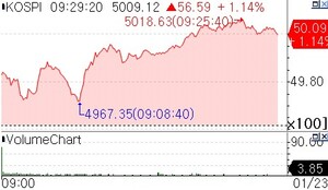 코스피가 장중 5,000선을 넘었다가 마감 때 하회한 후 다시 5,000선을 상회하며 출발했다는 소식입니다. 미국 증시의 상승세와 더불어 위험자산 선호 심리가 국내 증시에도 영향을 미치고 있는 것으로 보입니다.