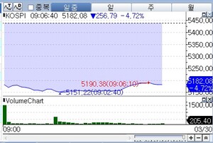 예멘 후티의 참전으로 중동 지역의 지정학적 긴장이 고조되면서 코스피 지수가 4.7% 급락하며 5,100선마저 위협받고 있습니다. 30일 오전 9시 6분 기준, 코스피는 전 거래일 대비 256.79포인트(4.72%) 하락한 5,182.08포인트에서 거래되었습니다. 코스닥 지수 역시 3.81% 급락하며 1,097.98을 기록했습니다.